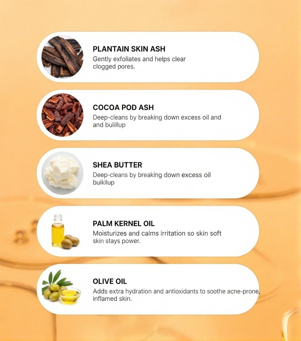 Gently clears acne, blackheads, whiteheads, dead skin, flaking, and eczema patches naturally. Improves skin texture and reduces inflammation. Targets discoloration and hyperpigmentation without harsh scrubs